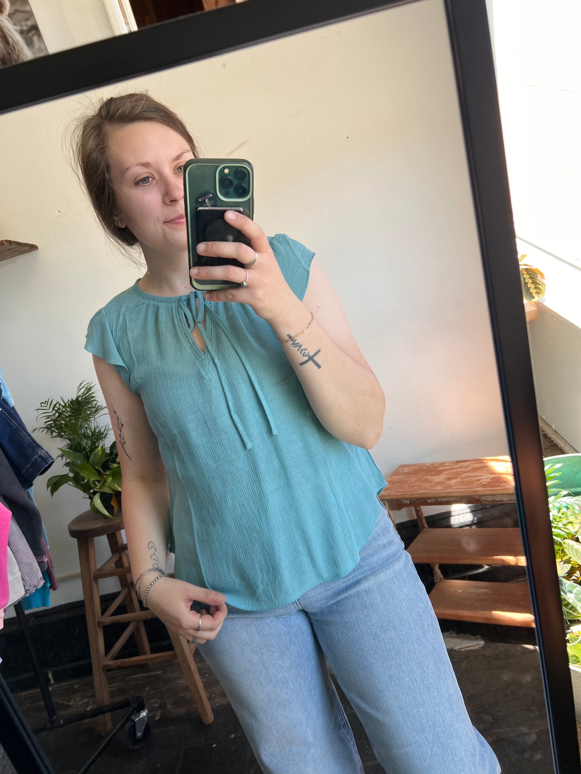 Get ready for summer in style with our New Time Top! This light teal top features playful ruffle sleeves, perfect for adding a touch of fun to your wardrobe. Stay cool and fashionable all season long.