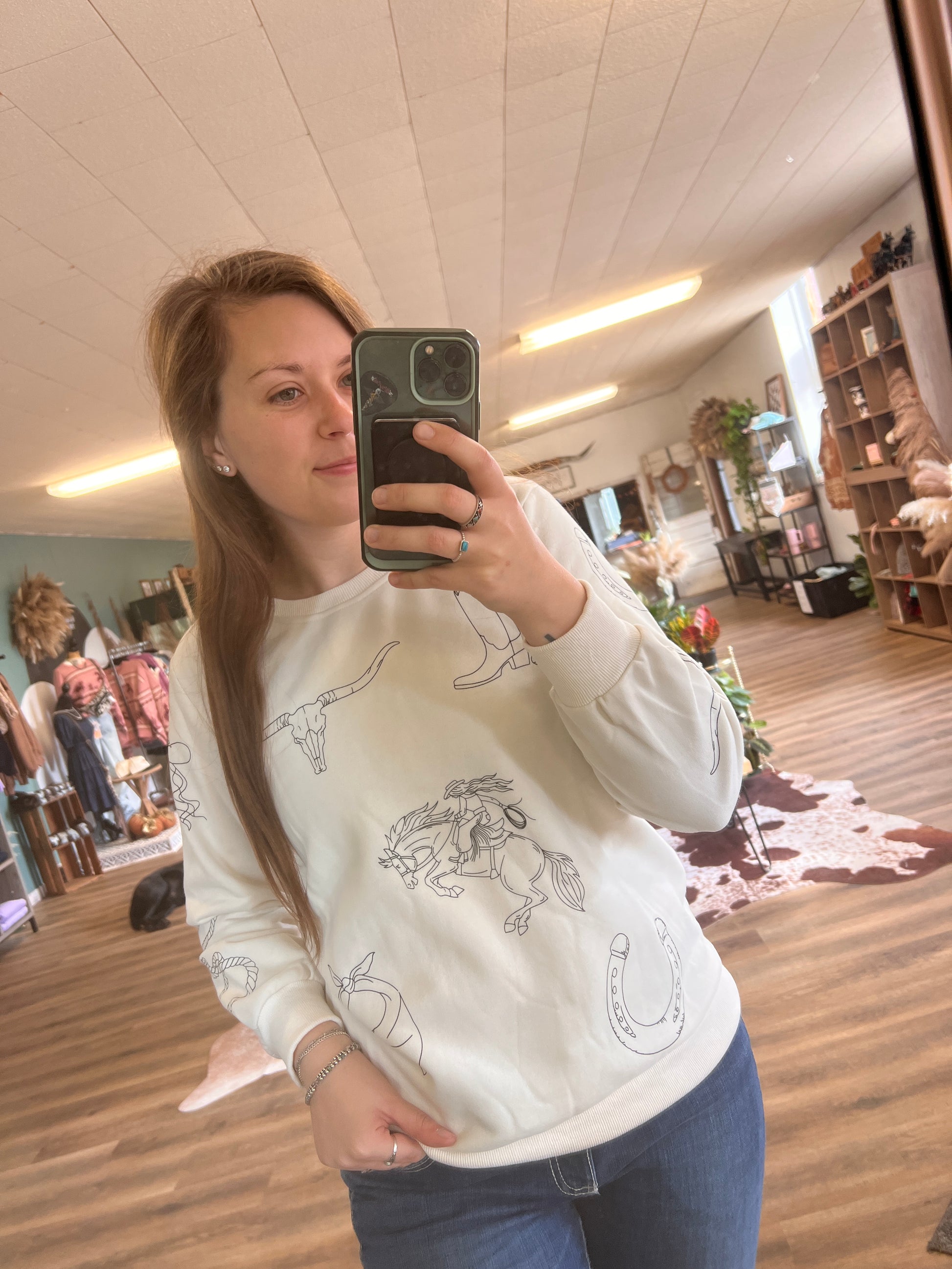 This round-up pullover is the perfect blend of comfort and style, with a cozy western print and a relaxed fit. The sleeves run slightly small, so for an even cozier fit, size up! Round up this must-have pullover for your wardrobe today!